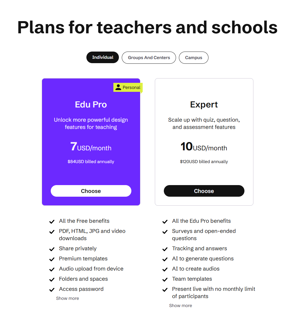 - Edu Pro/Pro: Removes watermarks and allows for privacy controls and basic downloads.