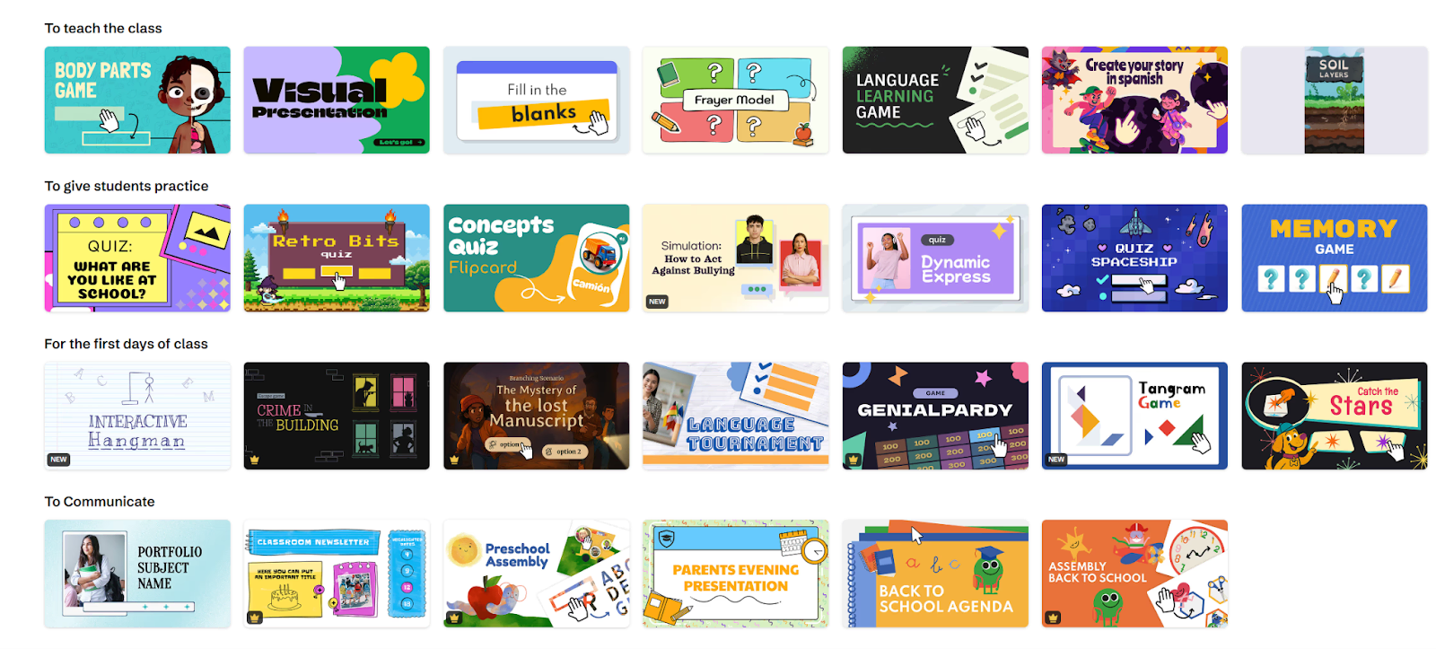 - Template Library: There are templates available, ranging from standard slideshows to Jeopardy-style games and digital escape rooms.