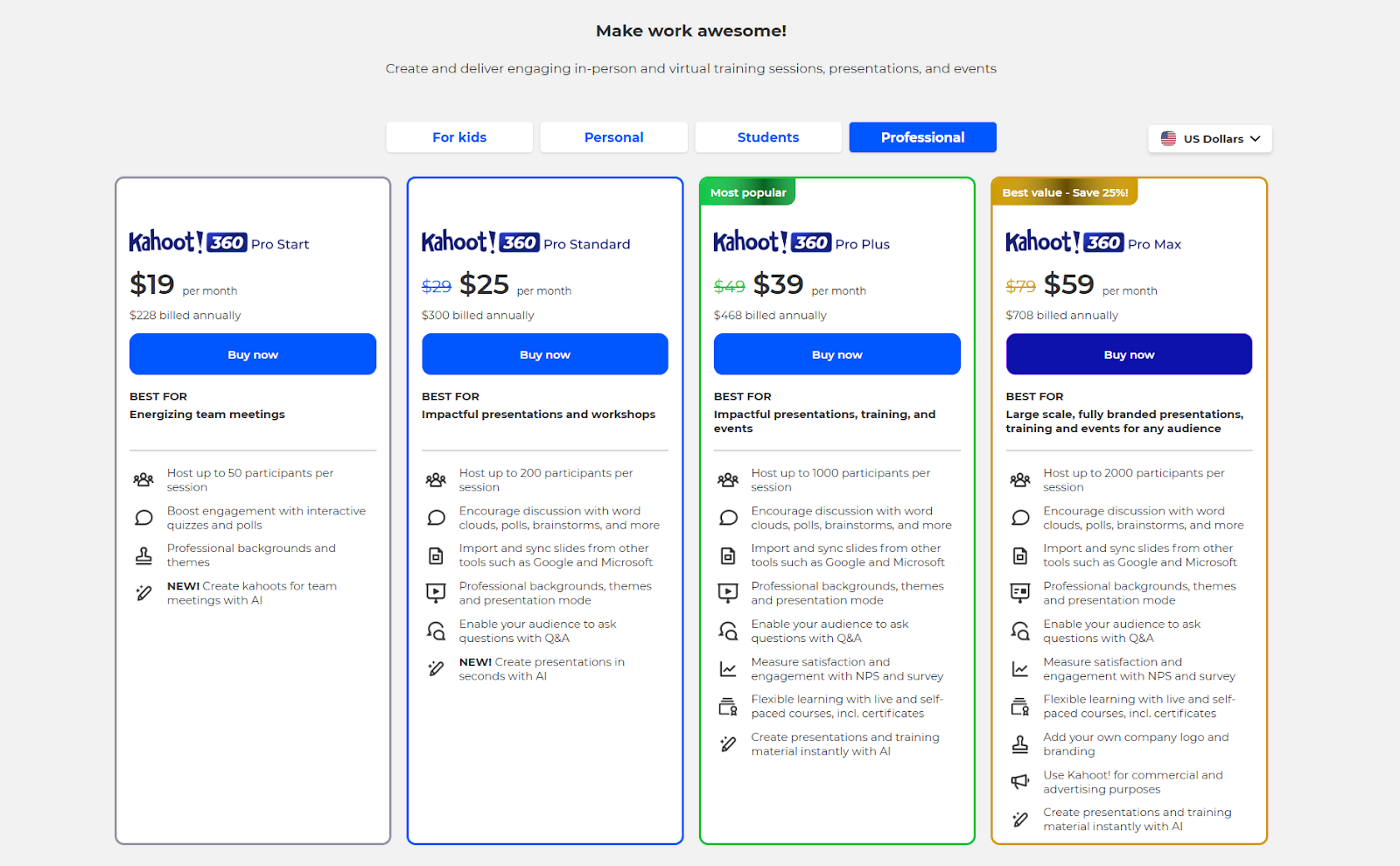 | Kahoot+ Max | ~$40/mo (billed annually) | All question types, branding, priority support |