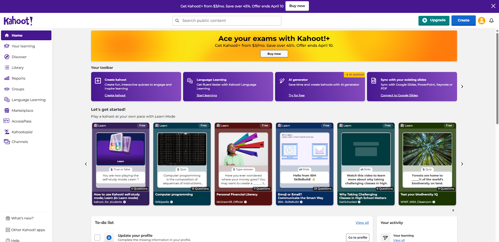 New in recent updates, Kahoot now includes an AI-assisted quiz generator. You can paste a topic or upload content, and the AI will generate a set of questions for you. It’s a time-saver for teachers who need to create quizzes quickly.