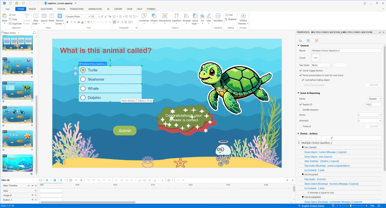 - Dynamic Triggers: You can trigger actions like “Jump to Slide” or “Play Audio” based on events such as “On Click” or “On Hover”.