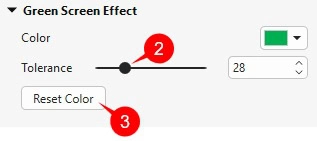 Step 2: Move the Tolerance slider (2) to adjust the range of color to key out. Higher values key out a wider range of color near the key color.