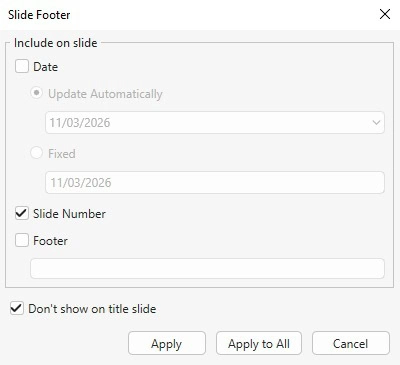 Step 2: Open the Insert tab > Footer. The Slide Footer dialog pops up.