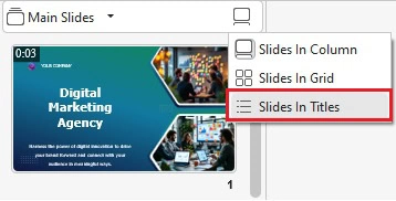 Step 1: Click the View Mode icon at the top of the Slides pane, then select Slides in Titles.