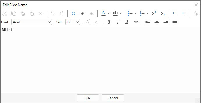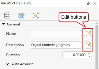 Click the Edit buttons next to the text boxes to further format the slide name or description. A text editor will appear: