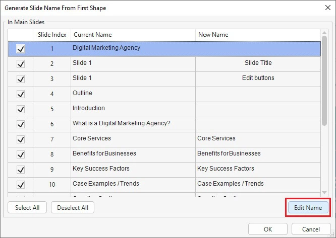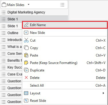 Step 2: Double-click each entry to edit the slide title. Or, right-click an entry > Edit Name to name a slide.