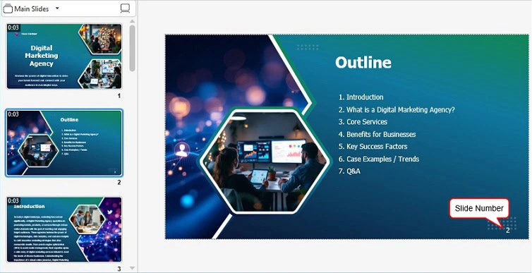 ActivePresenter 10 allows you to insert slide numbers easily with a few steps. You can use one of the following ways to add numbers and style all the slides or just a few of them.