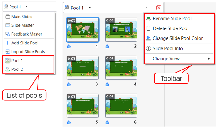 – Or click Import Slide Pools (2) to import slide pools from other ActivePresenter projects