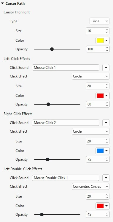 Cursor effects like cursor highlight, mouse click sounds and effects are all attributes of the Cursor Path object. You can style all attributes of the Cursor Path object the way you want and set it as the default of the current theme. To quickly and easily customize the default settings of the Cursor Path, you do the following: