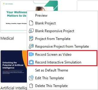 - Click on the theme and select Record Screen as Video or Record Interactive Simulation from the pop-up dialog.