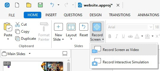 To record the screen with the custom cursor effects created earlier, in the current project, you access the Home tab and click on Record Screen. Then choose either Record Screen as Video or Record Interactive Simulation.