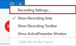 When you start recording the screen, the blue rectangle and the recording dialog appear. Now you need to click the Settings icon at the top-right corner of the dialog and select Recording Settings…