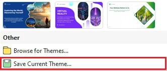 - After customizing cursor effects in the current project, you click on the Design tab > click the bottom drop-down arrow to expand the Themes gallery > Save Current Theme…