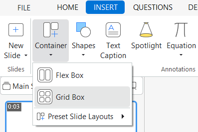 To insert a grid box, you click on the Home or Insert tab > Container > Grid Box.