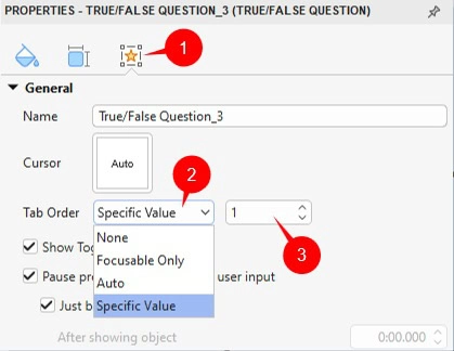 As said earlier, you can use the Tab Order to navigate between objects using the TAB key instead of clicking an object. This feature can be used for many objects such as text captions, buttons, check boxes, questions, and more. To view this feature, do as follows: