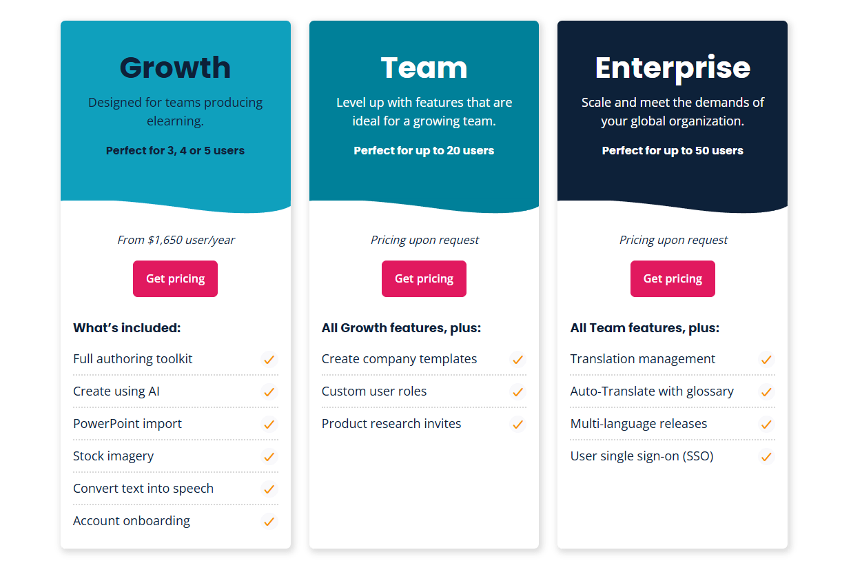 • Pricing is enterprise-tier — not accessible for solo instructional designers, freelancers, or small teams with tight budgets